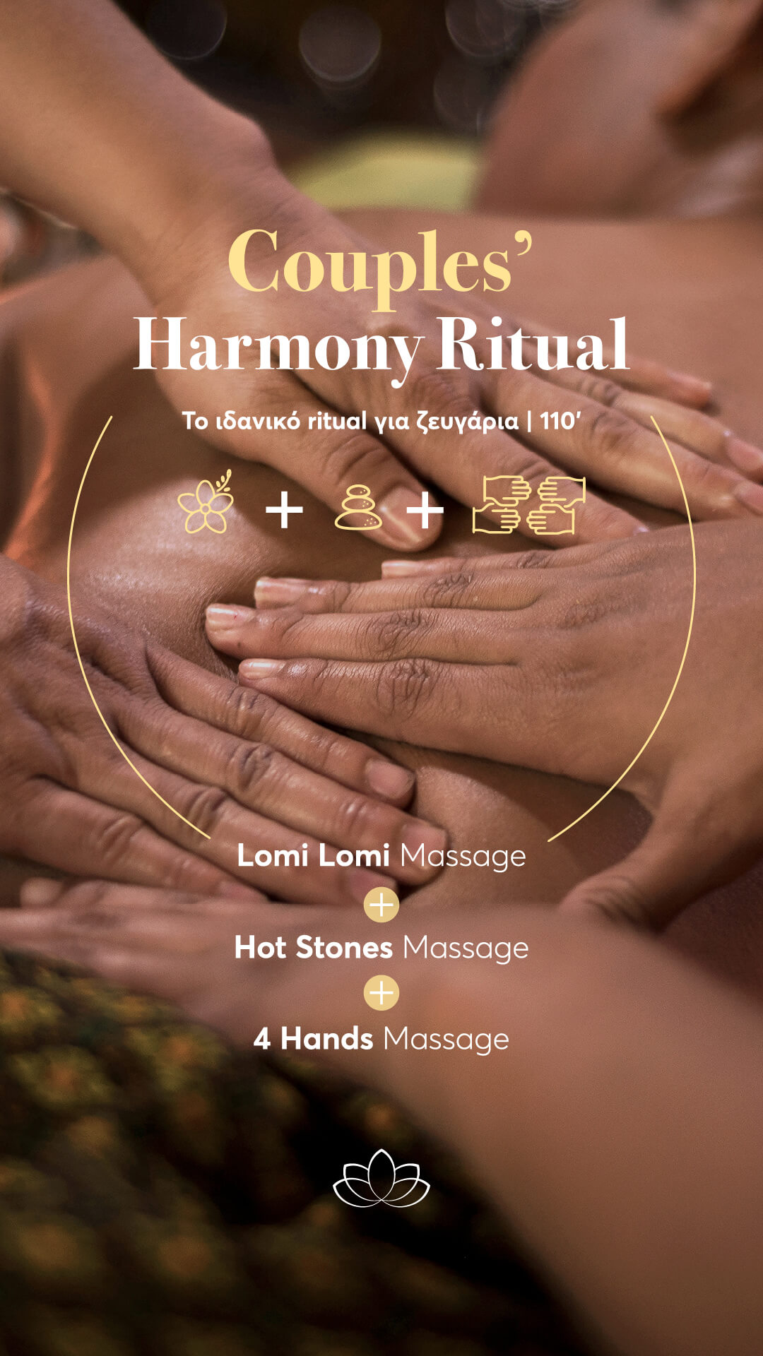 Το πιο απολαυστικό και ολοκληρωμένο ritual σύνδεσης για ζευγάρια, που συνδυάζει 3 τεχνικές μασάζ για μια πολυεπίπεδη εμπειρία ευεξίας.